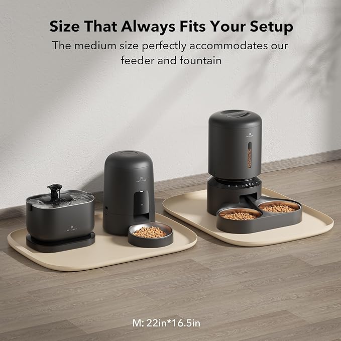 - A Perfect Fit For Every Pet And Bowl: With a range of sizes and colors to choose from, the Cove food mat is a versatile addition to any pet feeding station. The small mat measures 17.7 × 12 in, while the medium option measures 22 × 16.5 in. Not only do they fit perfectly with the PETLIBRO range of smart feeders and fountains, but they're compatible with various bowls and accessories too.