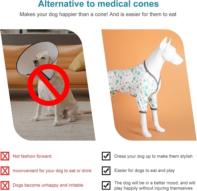 - A Buyer's Story: Our big dog had surgery on her stomach. Instead of using a cone we put the big dog pajamas on her and she never touched her incision or stitches.Great large dog pajamas. Highly recommend to get it. You won't regret it.