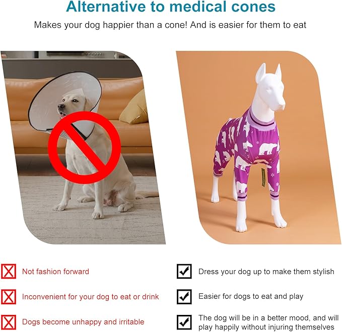 - Creative Design: This is a fully-wrapped dog pajamas. The highlight of the pajamas is a detachable cloth with 5 buttons on the abdomen.When your dog has undergone surgery, he can put on this pajamas to prevent licking wounds, during the period of hair loss or when the female dog wants to wean, this pajama is an excellent choice. When your dog no longer needs to protect the belly area, you can remove this cloth and wear it as everyday clothes.