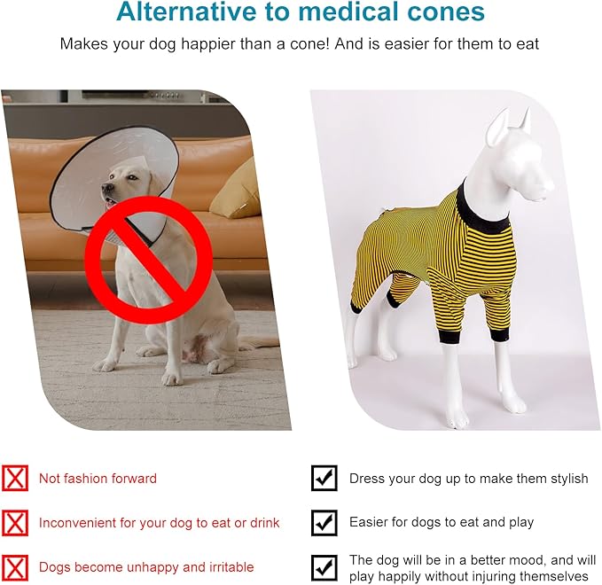 - Safety Huge Dog pjs: Lightweight Comfy materials do not irritate the skin like other Super-soft polyester, wool, nylon, denim or other artificial or rough fibers, do not cause skin irritation, dermatitis and itching and some infectious diseases. Dogs after surgery are more suitable for Comfy materials Large dog pyjamas, excellent protection for SKIN CONDITIONS, HOT SPOTS & ALLERGIES.