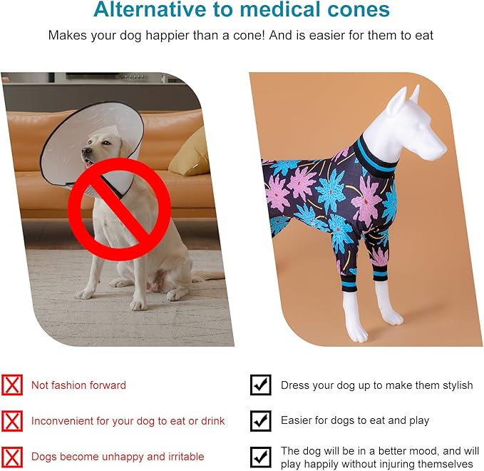 LovinPet Dog Recovery Bodysuit for Medium Dogs Girl, Lightweight Stretchy Fabric, Black, Turquoise Leaf Print, 2XL Surgery Recovery PJs, Easy to Wear Adorable Bodysuit