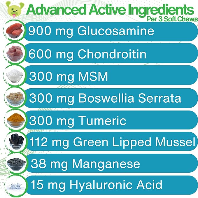 - Vet Recommended: Support your dog's joint health and extend their care with our Glucosamine and Chondroitin Dog Chews, formulated to provide essential nourishment for their joints in a convenient and enjoyable chewable form.