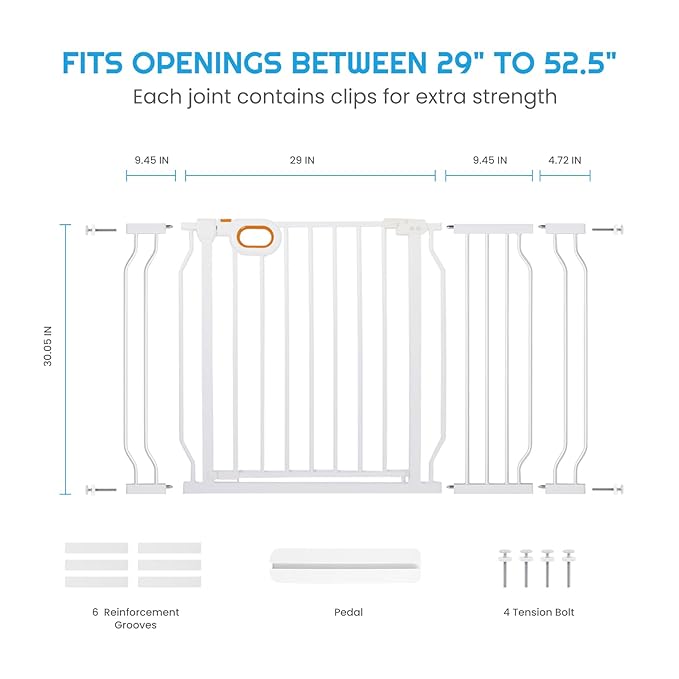 - 【Adjustable Width】This white baby gate features a rectangular design, with 2 x 4.7'' and 1 x 9.4 '' extensions included in the packaging. The height of 30.5 inches and the adjustable width of 29-52.5 inches ensures that your baby or pet is away from danger.
