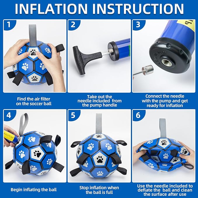 - QDAN Dog Soccer Ball Best Git For Your Dog - send your dog a bithday gift.House and Outdoor Dog Toyscan be played in the living room,pool,lake and beach, because it is also Water Toys Bal,no water absorplion,noseepage,no deformation.lightweight,easy to float in water.Dog Soccer Ball with Grab straps are great for dog catching