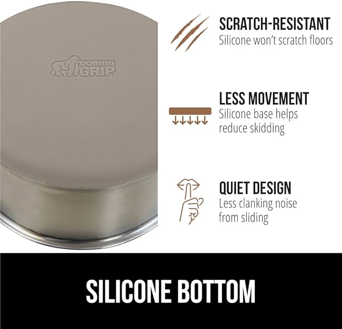 - SILICONE BOTTOM: the Gorilla Grip bowl is constructed from durable silicone that helps keep the bowl steady and wonโt scratch your floors; while some over eager eaters may still be able to slide the bowls, the silicone will help prevent much movement; plus, it reduces the noise from clanking and sliding across wood, tile, and more