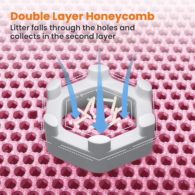 - Double-Layer Honeycomb Structure: The top layer features holes that capture all kinds of litter, allowing it to fall through to the waterproof bottom layer for easy cleanup. Simply pick up the kitty litter mat, pour the trapped litter back into the box, and reuse it—mess-free and effortless. This clever design minimizes litter waste and streamlines your daily cleaning routine.
