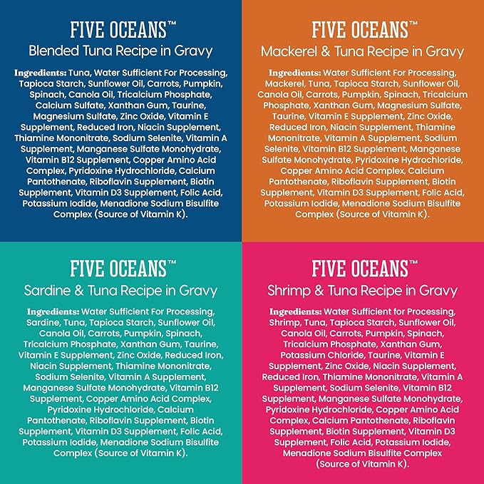- Real Tuna & Fish Protein in Gravy – Solid Gold Five Oceans cat wet food variety pack has a variety of fish protein in a savory gravy packed with hydration & flavor your cat will love. A grain-free cat food gravy option to support your cat's wellbeing