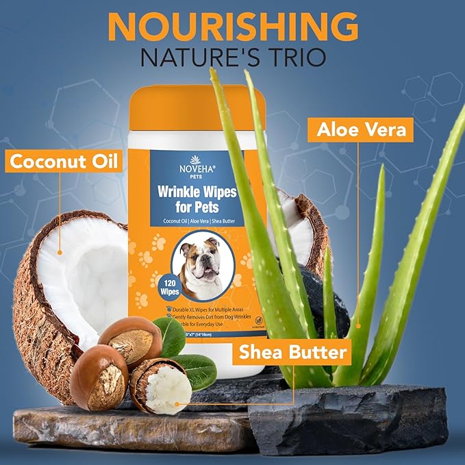 NOVEHA 120PCs - 5βx7β Large Dog Wipes | Wipes for Bulldog, French Bulldog, Pug, English Bulldog | Deodorizing, for Multiple Areas Removes Dirt, Wrinkles, Folds, Tear Stain, Tail Pockets & Paws