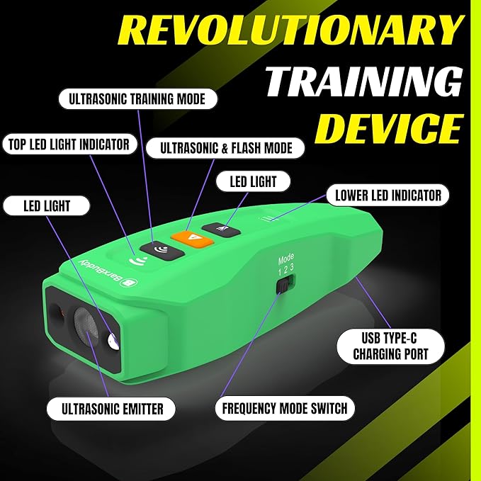 - Enhanced Battery for Reliable Training - Our bark stopper features a 1200mAh built-in battery, providing up to 60-days use on a quick 2-hour charge. Functions similar to a dog whistle to stop barking neighbors dog, and deterrent strobe flash assist in managing aggressive behavior, making BarksBuddy’s stop barking device the right choice for training small, medium and large dog breeds.