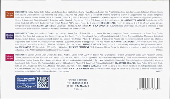 - Contains Twenty-four (24) 5.5-oz cans of BLUE Wilderness High Protein, Natural Adult Pate Wet Cat Food, Chicken, Salmon, Turkey