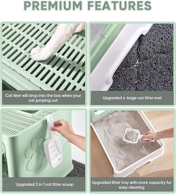 Cat Litter Box with X-Large Litter Mat and Scoop, Large Foldable Litter Box with Lid, Enclosed Kitty Box,Front Top Entry Exit, Odor Control Easy to Clean (Upgrade Green)