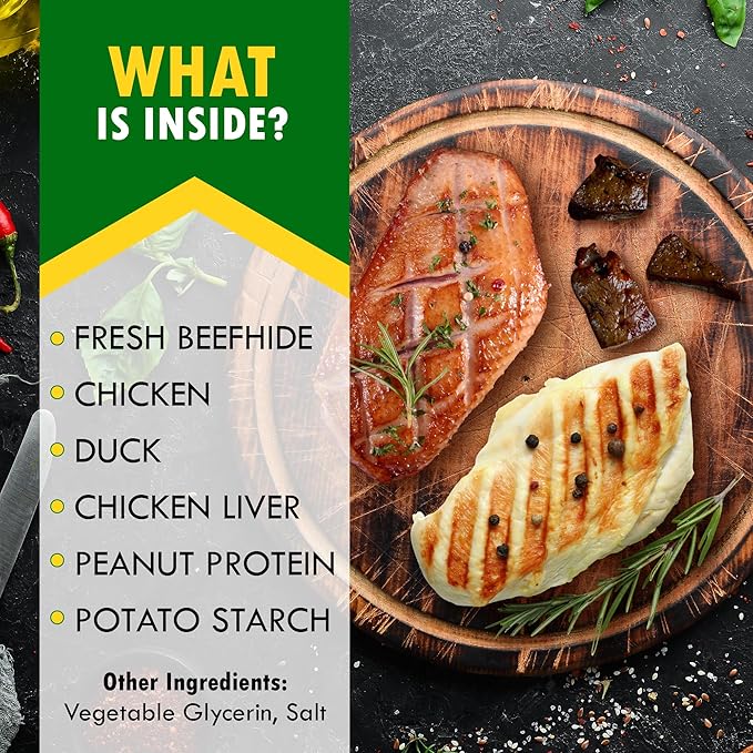 - NOURISH WITH HIGH PROTEIN from ALL NATURAL CHICKEN & DUCK: Our kabob dog treats aren't just delicious β they're packed with protein fatty acids to support your dog's skin, coat, and overall health. Say goodbye to dull coats and hello to shiny, healthy fur with every satisfying chew. Give your pup the nutritious reward they deserve while keeping their skin and coat looking their best.