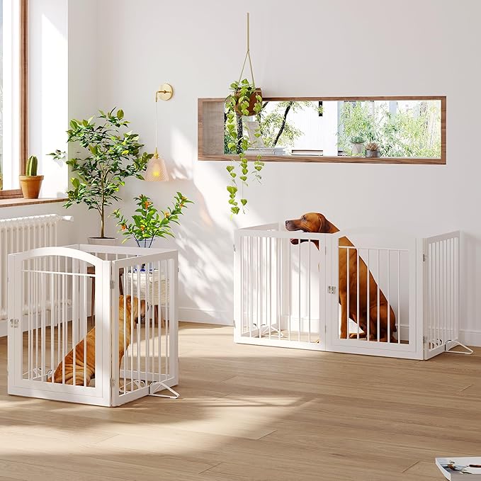 - 【SIMPLE & STURDY PET GATE】This convertible freestanding dog gate is a pet fence, room divider, and pet pen all in one.