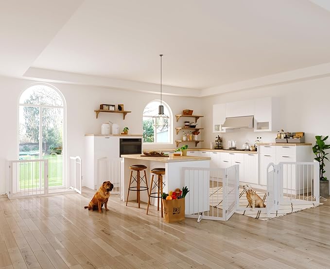 - 【SIMPLE & STURDY PET GATE】This convertible freestanding dog gate is a pet fence, room divider, and pet pen all in one.