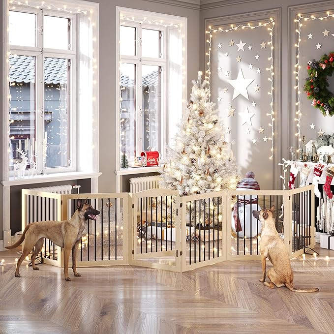 Vantas Folding Pet Gate 144" Wide, 30" Tall No-Assembly Wooden Dog Gate With Door Walk Through, Freestanding Puppy Safety Fence, 2PCS Support - Natural White