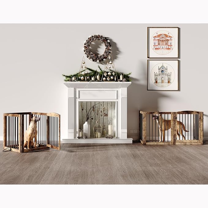 Vantas Folding Pet Gate 96" Wide, 30" Tall No-Assembly Wooden Dog Gate with Door Walk Through, Freestanding Pet Gate, Puppy Safety Fence, with 2PCS Support - Rustic Brown