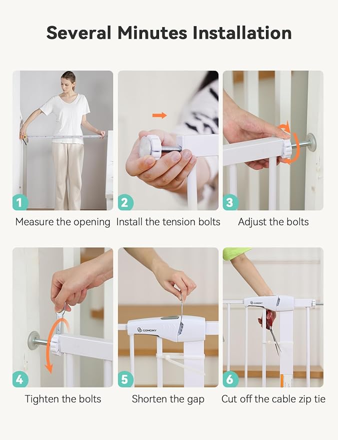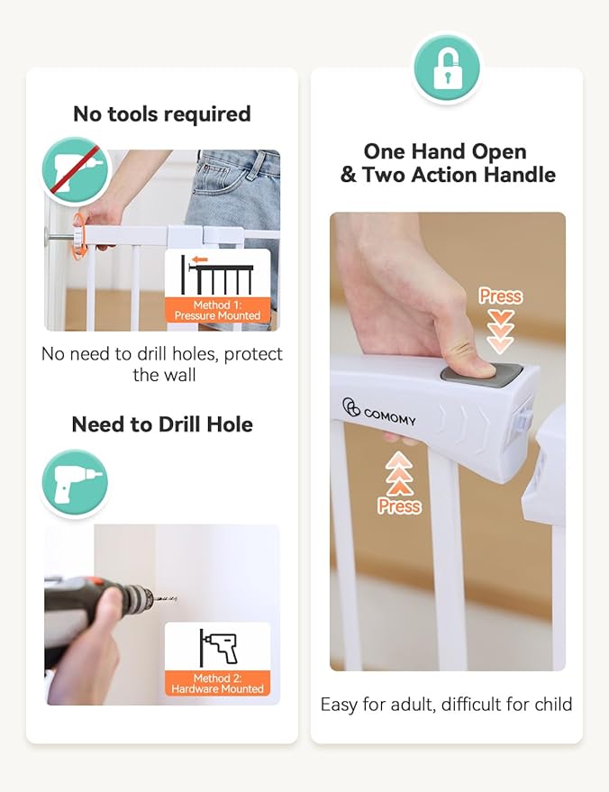 - Enhanced Security Feature: With upgraded safety features, the baby gates for doorways features a double-lock system that requires two buttons to be pressed for it to open. This ensures no accidental openings by either your baby or pets. Notice: Do not cut off the zip tie on the pet gates for dogs before installation is completed, or the gate will completely broken and is unusable