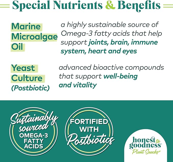 - SPECIAL NUTRIENTS – Our snacks are also infused with Marine Microalgae Oil, a highly sustainable source of Omega 3s, and Yeast Culture (Postbiotic), which contains advanced bioactive compounds that support well-being and vitality.
