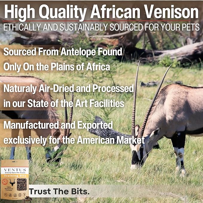 - All Natural Dog Treats: VENTUS Jerky Training Bits are perfect dog treats large breed, crafted from 100% wild venison. These single-ingredient, air dried dog food treats are free from additives and grains, making them ideal for healthy dog treats and organic dog treats.