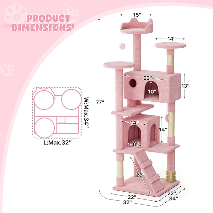 - Multi-Level Cat Climbing Tower Adventure: Standing 77” tall, this cat climbing tower boasts multi-levels of excitement, blending condos, platforms, and perches in a compact footprint. Cats can leap, explore, and survey their domain from multiple heights, fulfilling their instinct to conquer vertical territory, ideal for both kittens and adult cats