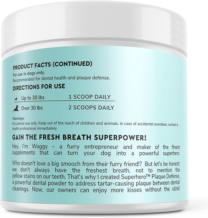 - EASY TO USE: For dogs of all breeds, ages, and sizes! Just sprinkle one scoop of this health supplement in your pet’s food for dogs up to 30 pounds and 2 scoops for dogs over 30 pounds. Plaque can cause bad breath and leave pets’teeth stained and yellow. Our plaque & tarter supplement for dogs helps support gum health, teeth, fresh odor and a healthy mouth. Give your pet delicious oral health today!
