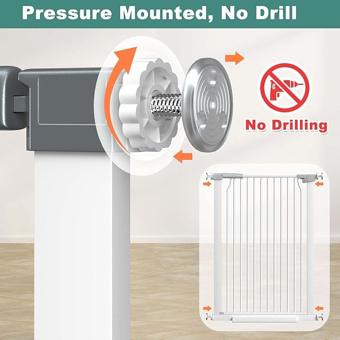 - 【Easy Installation】The pressure-mounted baby gate comes with adjustable pressure bolts, no tools required, no need to drill. You can easily install or remove the gate when needed without causing any damage to the door frame or walls. Tension baby gate is used for the house indoor outdoor.