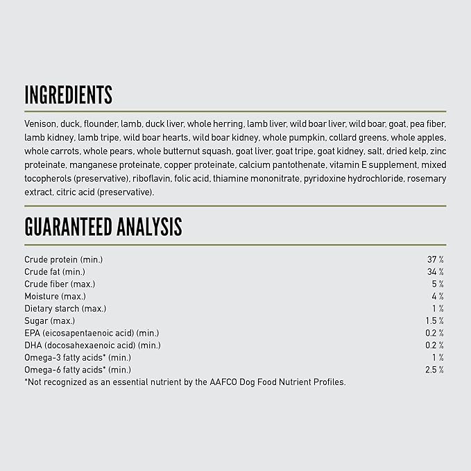 - This freeze-dried dog food is made with 90% raw animal ingredients* including venison, duck, wild-caught flounder, lamb and wild boar.