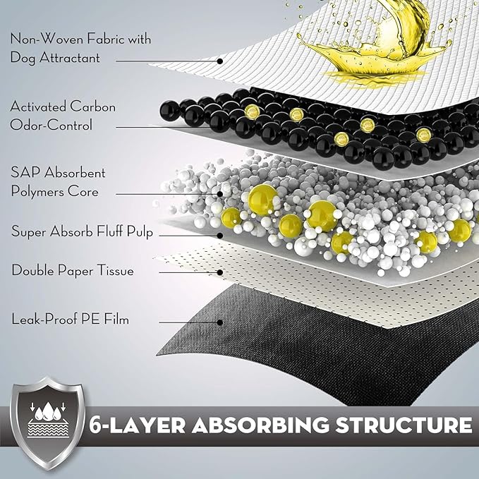 - Innovative 6-Layer Super-Absorbent Design: Six layers including a non-woven top layer for rapid absorption; diamond quilted pattern directs liquid flow; activated carbon layer eliminates odors; super-absorbent polymer core holds 4 to 12 cups of liquid; waterproof PE backing prevents leaks and floor damage