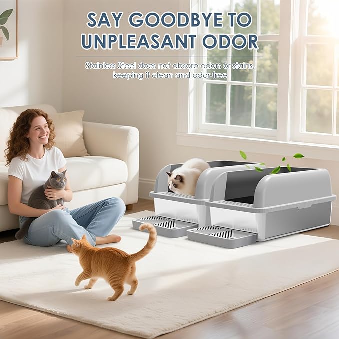 - Say Goodbye to Stinky Litter Boxes: Plastic litter box can trap odors no matter how much you clean, but our smooth litter box stainless steel surface allows waste to slide off easily without sticking. No absorbed smells, no stains, just quick and easy wiping to keep the box fresh. What's more, stainless steel wonโt rust or scratch, which prevents odor buildup and provides a more hygienic environment for your cats
