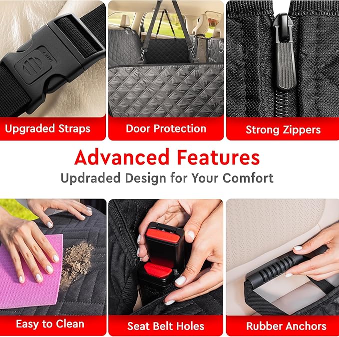 - Upgraded Design β Features a durable net between front seats, 2 storage pockets, and easy access for seat belt buckles. Enhanced straps, buckles, and zippers offer added reliability. Non-slip backing and rubber hangers keep the seat cover secure. Includes a storage bag for convenience.