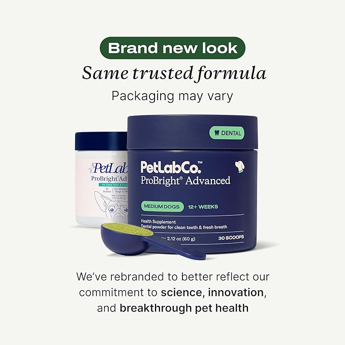 PetLab Co. ProBright Advanced Dental Powder - Dog Breath Freshener - Teeth Cleaning Made Easy – Targets Tartar & Bad Breath - Packaging May Vary - Formulated for Medium Size Dogs