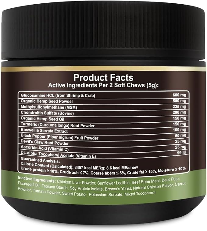 - HEALTHY HIPS AND JOINTS & MOBILITY BOOST: These soft chews stimulate cartilage development, improving healthy joint fluid viscosity, bone and joint health. The potent and natural formula includes effective ingredients such as glucosamine, chondroitin, and turmeric, organic hemp seed oil maintaining robust bone and joint function by improving joint and connective tissue function. It helps alleviating inflammation associated with regular daily exercise and activity.