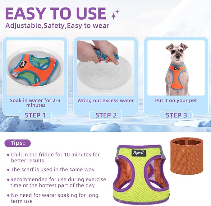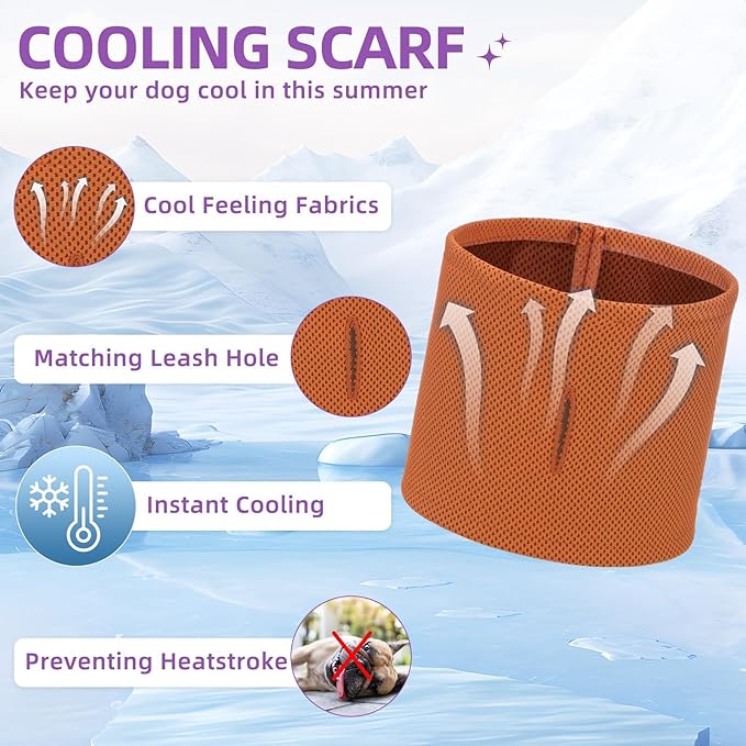 - [DOG HARNESS, COLLAR & LEASH] - The package includes three items, a walking harness, a scarf collar, and a 4.9ft matching leash. The scarf collar is made of cooling, breathable and heat-dissipating fabric, the leash is equipped with a 360-degree rotation metal hook, and the harness is adopted with a quick-release buckle and double D-rings which are very heavy-duty. You don't need to spend extra time looking through other accessories, this is a very cost-effective set.
