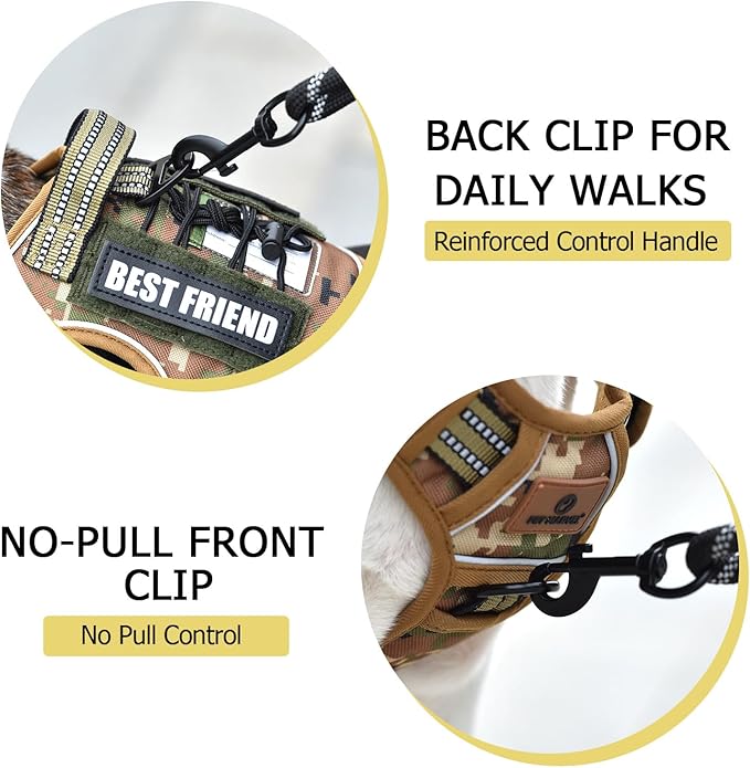 - MOLLE System: Featuring multiple Hook & Loop panels and additional MOLLE straps, our tactical harness can carry a variety of equipment, including pouches, water bottles, and tactical dog gear. It's versatile for personal service, law enforcement, hunting, or outdoor adventures. This system also shows your dog's personality; the package includes an extra "BEST FRIEND" label for customization