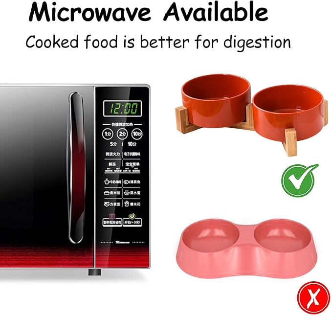 - Double Bowl Design:One dog bowl for food and one for water, Each ceramic cat bowl has a Unique wooden stand, raising the dishes closer to your pet for more comfortable eating.