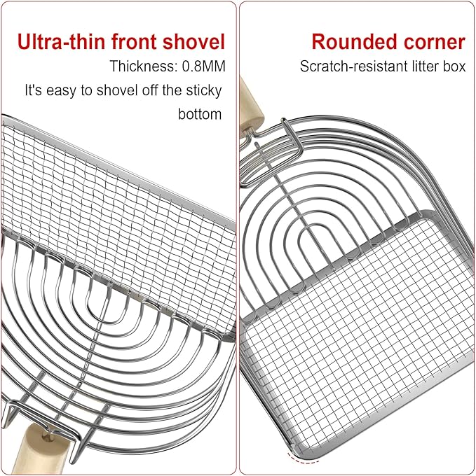 - Durable Material: The cat litter shovel is made of iron material with surface plating treatment, anti-rust, sturdy and durable, eucalyptus wood handle, comfortable grip