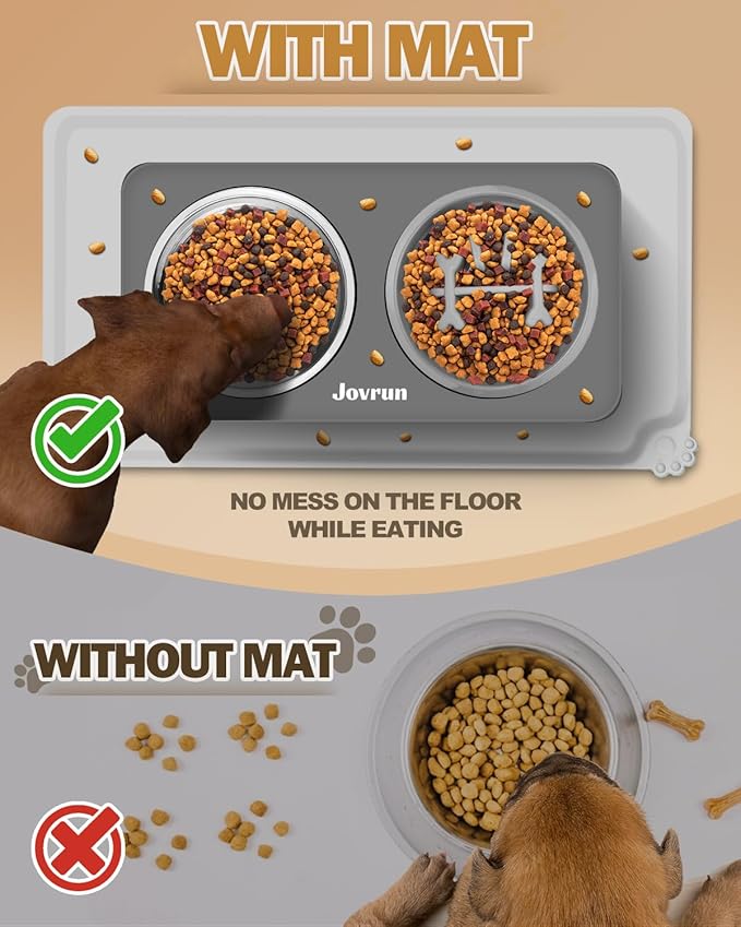 - Fully Equipped & Dishwasher Safe: Comes with a total of two stainless steel bowls and 1 slow feeder dog bowls and a 21.6 x 14.9 inches Silicone Mat. The size of the bowls is 7.8 inches inner diameter, perfect for dry kibble, wet food, treats, or water. The raised dog food bowls for large dogs are safe for easy cleaning, you can put the whole bowl in the dishwasher.