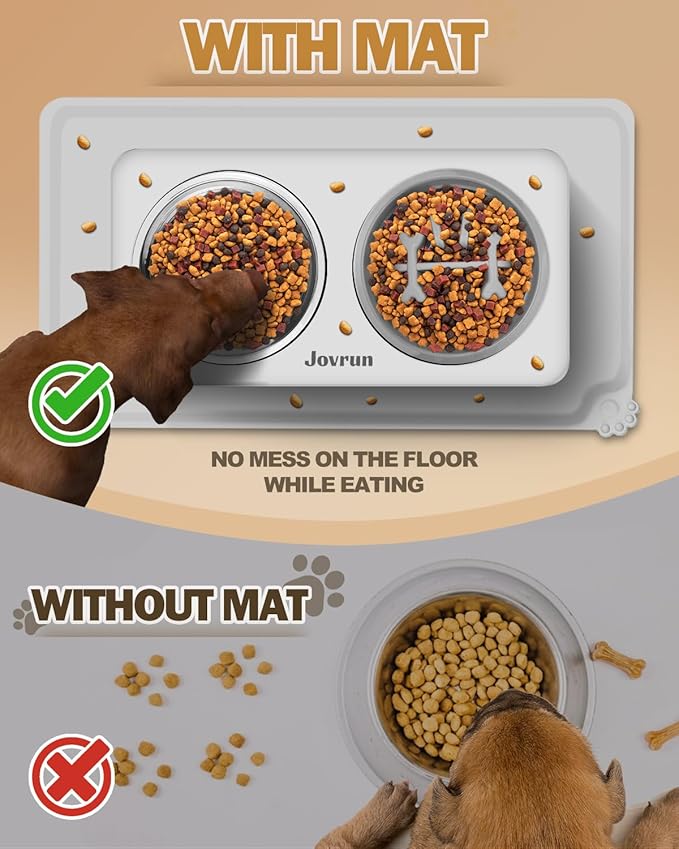 - Fully Equipped & Dishwasher Safe: Comes with a total of two stainless steel bowls and 1 slow feeder dog bowls and a 21.6 x 14.9 inches Silicone Mat. The size of the bowls is 7.8 inches inner diameter, perfect for dry kibble, wet food, treats, or water. The raised dog food bowls for large dogs are safe for easy cleaning, you can put the whole bowl in the dishwasher.