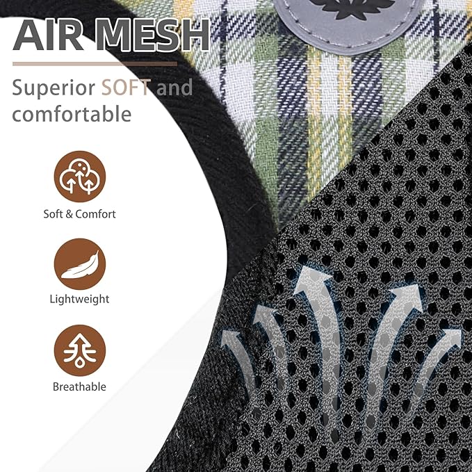 - [REFLECTIVE, PLAID PATTERN] - This Harness has two sides of reflective straps, and the middle logo also is reflective, so if you walk with your dog at night, then both of you will be safer! In addition, the classic plaid pattern is designed by our internal brand team, so it's very different from other normal harnesses. This plaid pattern looks both classic and stylish and is never out of date.