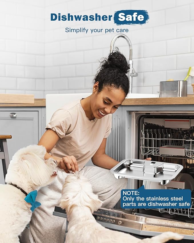 - Simple Care, Maximum Convenience: Our stainless steel dog water bowl dispenser is a breeze to clean. All stainless steel components are dishwasher safe, cutting down on maintenance time. The smooth surface resists dirt buildup, making handwashing effortless. Detachable parts ensure thorough cleaning with no hidden nooks. Plus, our pet fountain is designed for easy assembly, disassembly, and refilling, making pet care a cinch