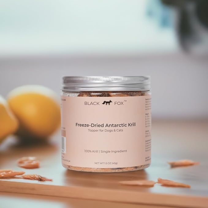 BLACK FOX Freeze-Dried Antarctic Krill Dog Treats | Cat Treats | Cat Food Topper | Dog Food Topper | 1.5 oz Single Ingredient, Raw, Healthy, All Natural, Human Grade, Omega-3 Fish Oil