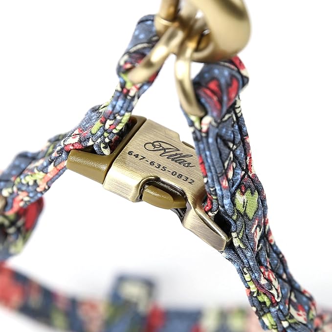 - Customizable engraving: Personalize your dog's harness with engraved details on the brass buckle, be it their name, your contact information, or any text of your choice, ensuring they're always identifiable and safe.