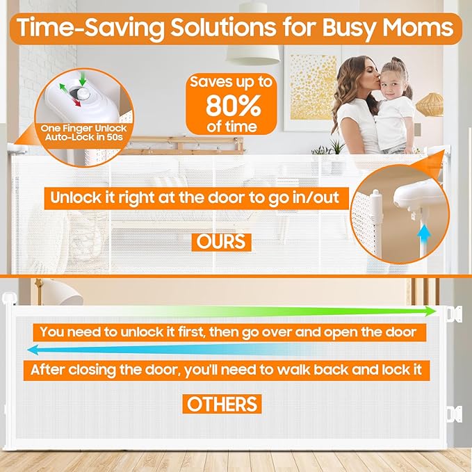 - 【Specially Designed for Busy Moms】We have 2 locking mechanisms. One is a mesh locking mechanism that automatically locks after a countdown timer, and also controls the extension and retraction of the mesh. The other is a gate locking mechanism - simply unlock the gate right where you are, and the gate will open. And the gate will automatically lock when closed, for quick and easy access. Unlike other baby gates, you don't have to go through a multi-step process of unlocking the mesh, then opening the gate, and finally remembering to lock the mesh again. Our baby gate saves you that hassle