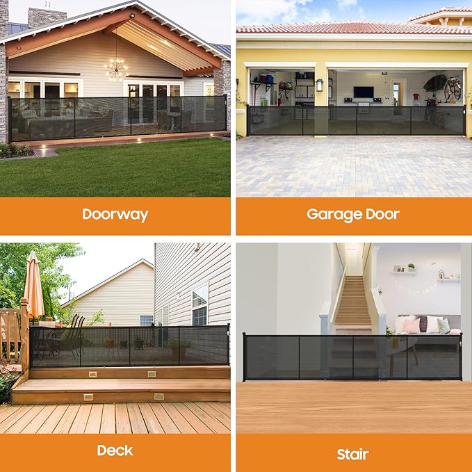 - 【Fiberglass Support】We have upgraded the retractable gate with fiberglass support strips, which prevent kids and pets from going under the mesh and reduce wrinkling. The mesh expands smoothly without getting stuck, making it effortless to use.
