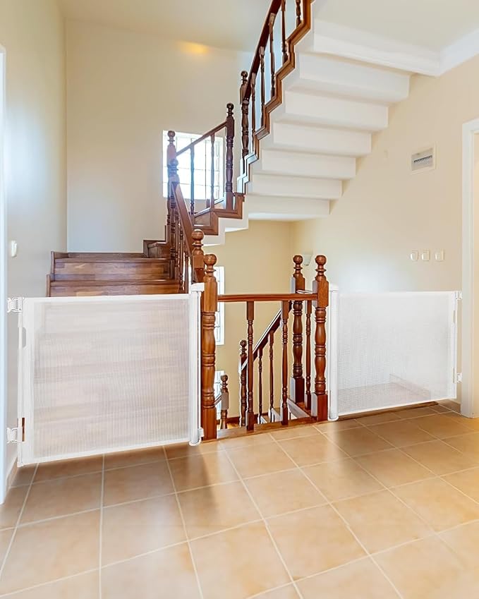 - Superior Design for Maximum Coverage:The extra-wide, retractable mesh gate extends up to 55" wide and stands 33.6" tall, making it perfect for use in doorways, stairways, hallways, and more. The mesh retracts fully when not in use, saving space. Unlike traditional gates, this design eliminates tripping hazards with no bottom balustrade, making it safe for households with busy parents and pets.