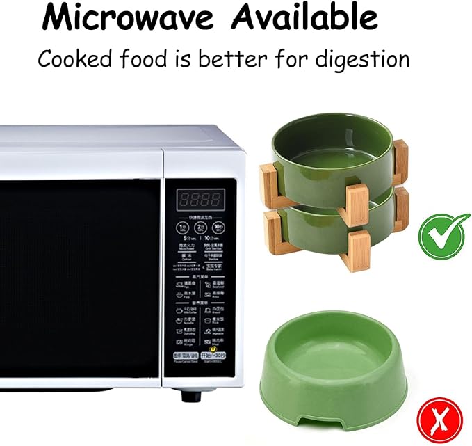 - EASY TO CLEAN CERAMIC - This easy clean dog bowl set is dishwasher proof, as well as easy to handwash and wipe down. With thick walls, these ceramic bowls for pets are sturdy, leak-free and weighty yet not too heavy. Double Bowl Design:One dog bowl for food and one for water, Each ceramic cat bowl has a Unique wooden stand, raising the dishes closer to your pet for more comfortable eating