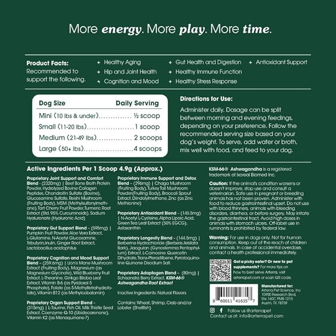 - Premium, Natural Ingredients: Made with 46 powerful ingredients for maximum anti-aging benefits, Arterra’s formula is developed by veterinarians and backed by science to ensure the highest quality and efficacy. Our product delivers more comprehensive health support than others on the market, significantly outperforming competitors in both ingredient quality and dosage. Made in the U.S.A., 100% filler-free, and backed by our Results Guarantee, Arterra is the superior choice for your dog’s health needs.