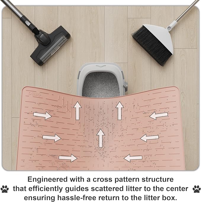 - Easy to Clean: This unique inner pattern ensures that no matter which side you lift the mat, the cat litter naturally flows along the grooves toward the center — making it easy to pour back into the litter box or sweep away with a broom. For quick cleanup, simply shake off or rinse the mat with water to remove any remaining litter, leaving it clean and ready for reuse