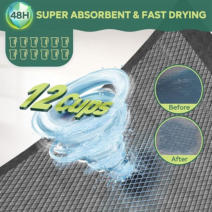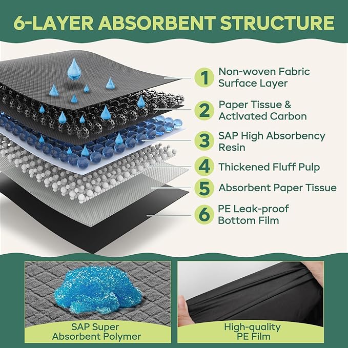 - Upgraded 6-Layer Design, Super Absorbent, Holds Up to 1200ml: Featuring super absorbent polymers, these pads quickly convert liquids into gel, locking in moisture within seconds and preventing overflow. They keep pets dry and comfortable all day long. The quick-drying surface ensures easy and hassle-free cleaning.