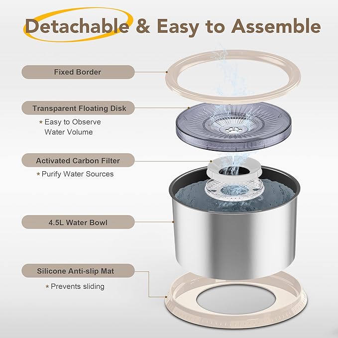 - Easy to Clean: The removable floating disk combined with the filter made of non-woven fabric, activated carbon and ion exchange resin can filter the water layer by layer to remove impurities hair and other fine particles, deeply purify the water and provide clean, fresh water. We recommend disassembling and cleaning the floating disk at least twice a week and replacing the filter every 2 months